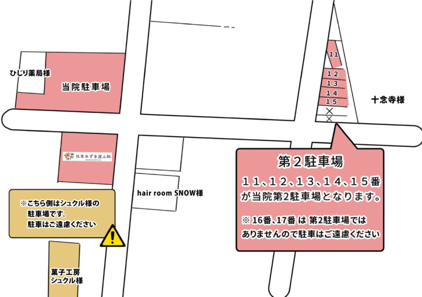 第2駐車場のご案内 投稿日:2024.09.09 第2駐車場新設のご案内 これまで時間帯によってはクリニックの駐車場が満車となりご迷惑をおかけしておりました。 このたび、クリニックの東方向約50mに5台分の駐車スペースを確保いたしました。 月極駐車場のうち11番・12番・13番・14番・15番が当院第2駐車場となります。 どうぞご利用くださいませ。